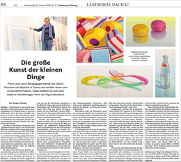 ... Hier kommt er ganz groß raus, der kleine Löffel, hier kann er mal so richtig glänzen. Im Original misst er nur acht Zentimeter, doch auf dem Gemälde von Petra Levis hat er die Dimensionen eines Paddels. In dieser Größe zeigt er seine ganze Schönheit, ... Zu sehen ist der kleine Charmeur beim „Rendezvous der Dinge“. Den Titel hat die Münchner Malerin ihrer Ausstellung gegeben, die ab Donnerstag in der KVD-Galerie in Dachau zu sehen ist. ... [. . .] > PDF